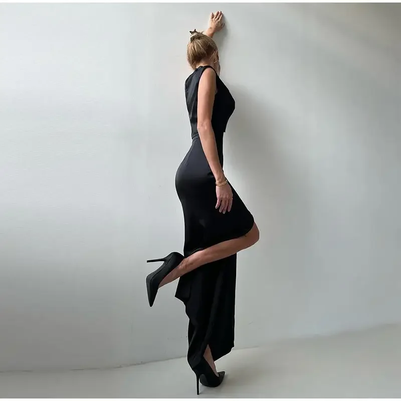 A saia longa, com comprimento na altura do tornozelo, complementa o top e apresenta um fecho de braguilha discreto, proporcionando um caimento fluído. A decoração de botões na saia adiciona um charme sutil, elevando o conjunto.
