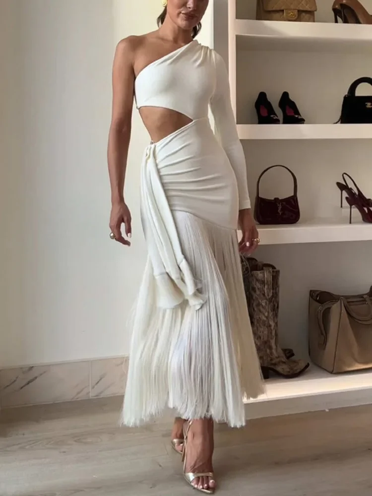 Design Inovador: Estilo de um ombro com detalhe de borla plissada, para um toque de originalidade.